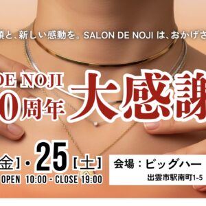 READ MOREサロンドノウジ出雲店リニューアル5周年! 5周年記念フェアを開催! 金の価格高騰が続く今!感謝の気持ちを込めてサロンドノウジは価格への挑戦を行います すべて1点モノのジュエリーを最大50%オフ! 全国どこよりも挑戦した価 […]
